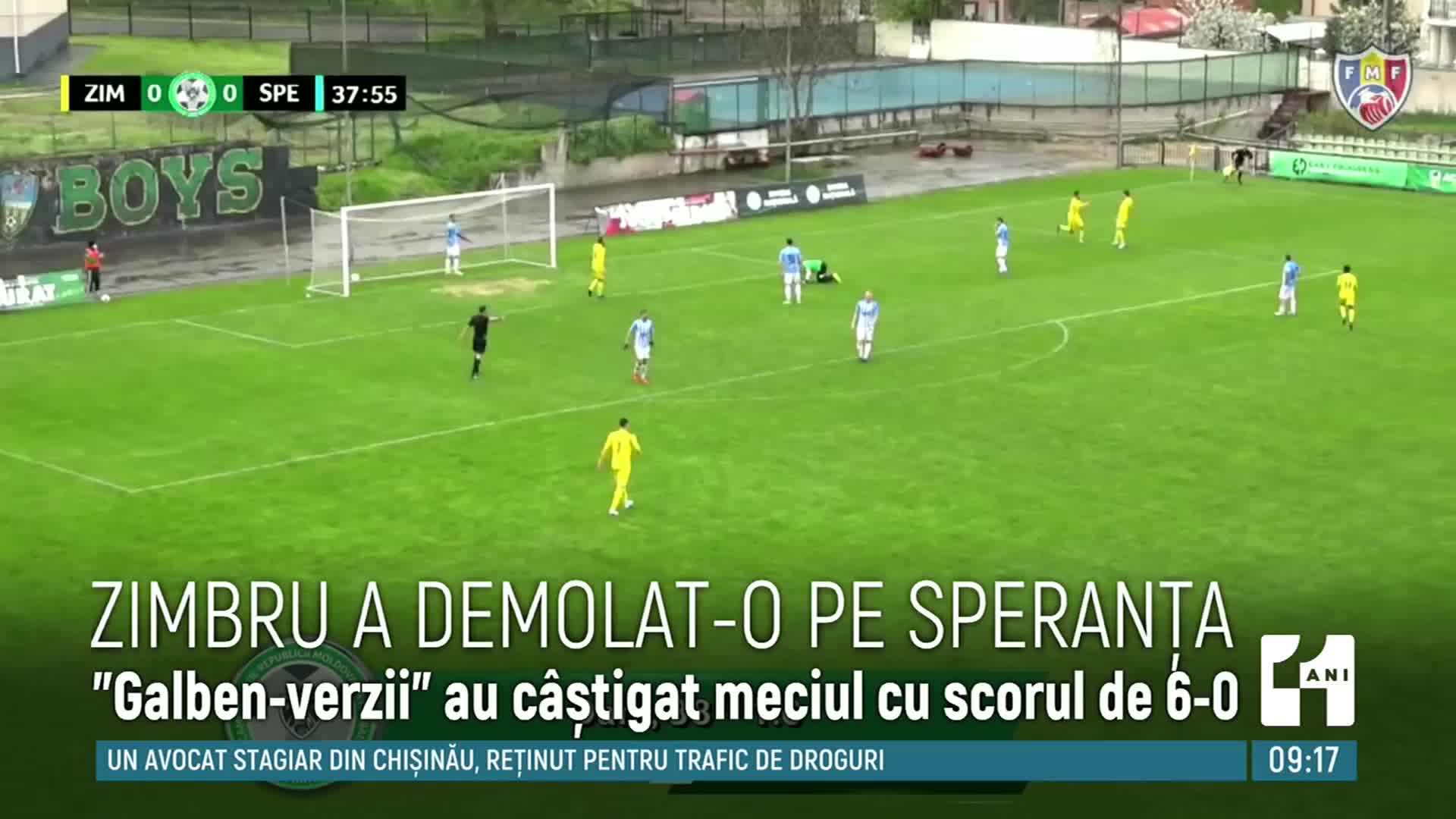 Zimbru Chișinău a obținut cea mai categorică victorie în Divizia Națională din ultimii 7 ani. "Galben-verzii" au surclasat-o pe Speranța Nisporeni cu scorul de 6-0, într-un meci din cadrul etapei a 29-a din campionat.