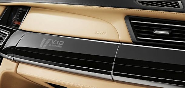 Ediţia specială "V-12 25 Years Edition" prezintă un interior echipat de specialiştii de la BMW Individual. Habitaclul este decorat în piele Full Merino, nuanţa "Champagne" din gama Individual şi are cusături negre. Covoraşele sunt negre şi au cusături în nuanţa "Champagne". Pe lângă aceste elemente, avem un sistem de multimedia pentru locurile din spate, cu tot cu iDrive, jante din aliaj de 20 inch, modelul 301 din gama Individual, plafon îmbrăcat în Alcantara, nuanţa "Champagne", montanţii laterali îmbrăcaţi în piele neagră, ornamente din lemn "Piano Black" din gama Alcantara, volan cu inserţii din lemn "Piano Black" şi ornamente exterioare Shadowline. Toate tetierele, pragurile laterale şi comenzile iDrive sunt inscripţionate cu numele acestei ediţii speciale.