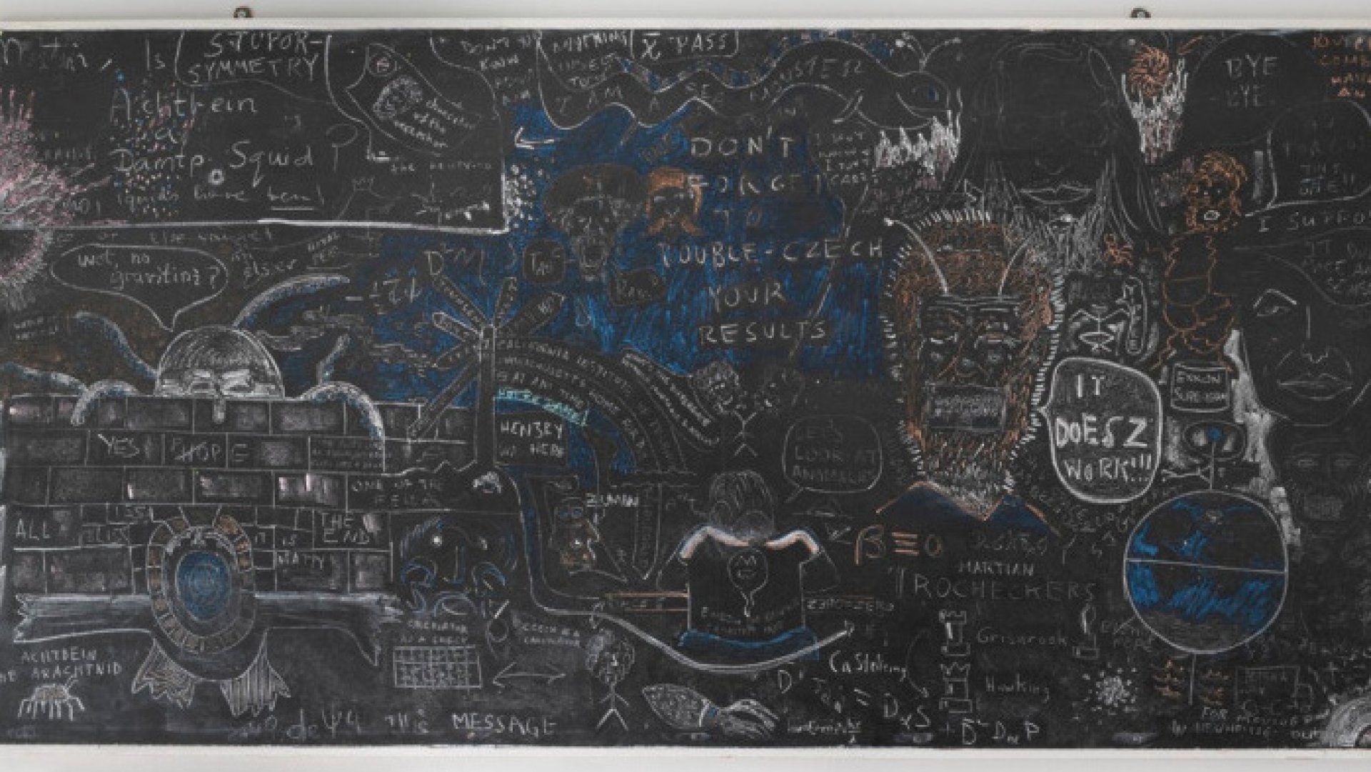Tabla din expoziţie ilustrează simţul umorului al lui Hawking şi a fost folosită în timpul unei conferinţe din 1980, cercetătorul având-o înrămată şi atârnată în biroul lui.