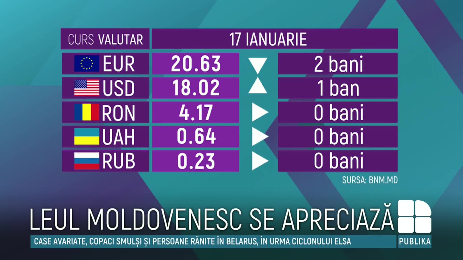 Leul moldovenesc se apreciază în raport cu moneda europeană. Banca Naţională a stabilit pentru luni, 17 ianuarie, un curs de 20 de lei şi 63 de bani pentru un euro, cu 2 bani mai puţin decât în ziua precedentă.