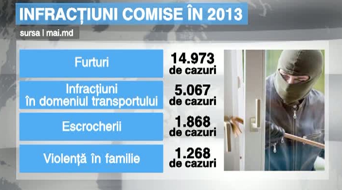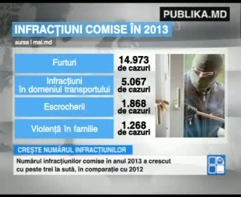 Statisticile Ministerului Afacerilor Interne arată că în 2013 au fost înregistrate peste 36 de mii de infracţiuni. Aproape 15 mii dintre acestea sunt furturi, iar peste 5.000 - infracţiuni în domeniul transportului. În top urmează escrocheriile - aproximativ 1.800 de cazuri, dar şi cele de violenţă în familie - mai mult de 1.200.
