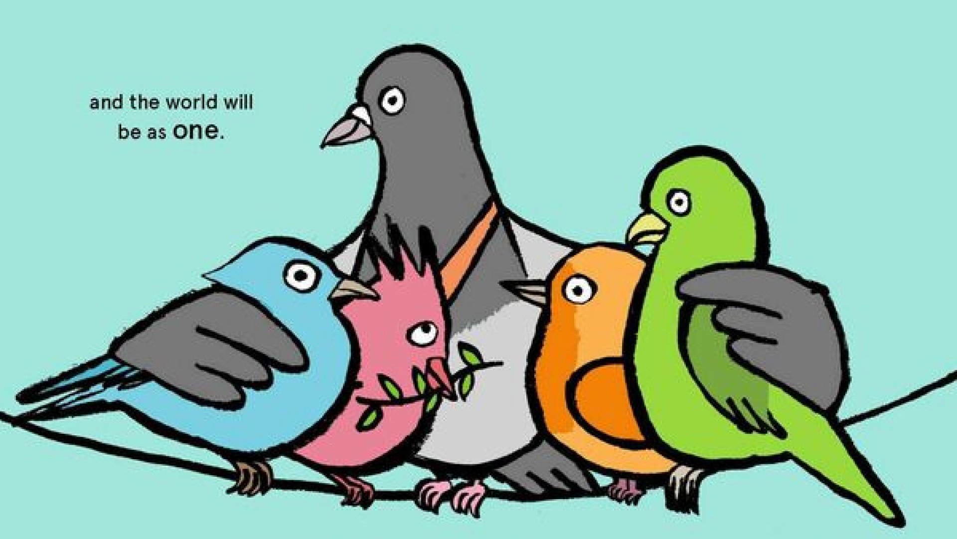 Este ceea ce face acest porumbel care călătorește cu metroul cu o geantă plină cu ramuri de măslin, apoi se ridică în zbor deasupra mării pentru a despărți doi pescăruși care se ceartă pe un pește și care protejează cu aripile sale alte păsări. Deși cartea se adresează copiilor cu vârste între 5 și 12 ani, editura este de părere că versurile scrise de Lennon ar trebui să devină "un imn mondial" pe care adulții să-l împărtășească copiilor și nepoților lor.... un mesaj de pace.