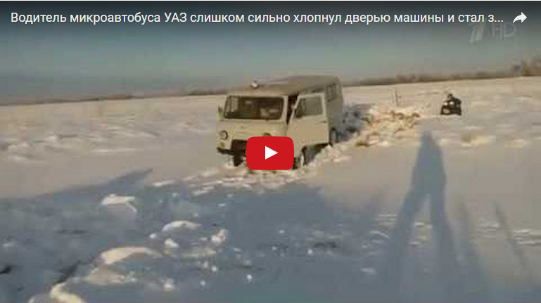 Şoferul unui UAZ s-a enervat rău când a văzut că maşina lui a rămas blocată în nămeţi.