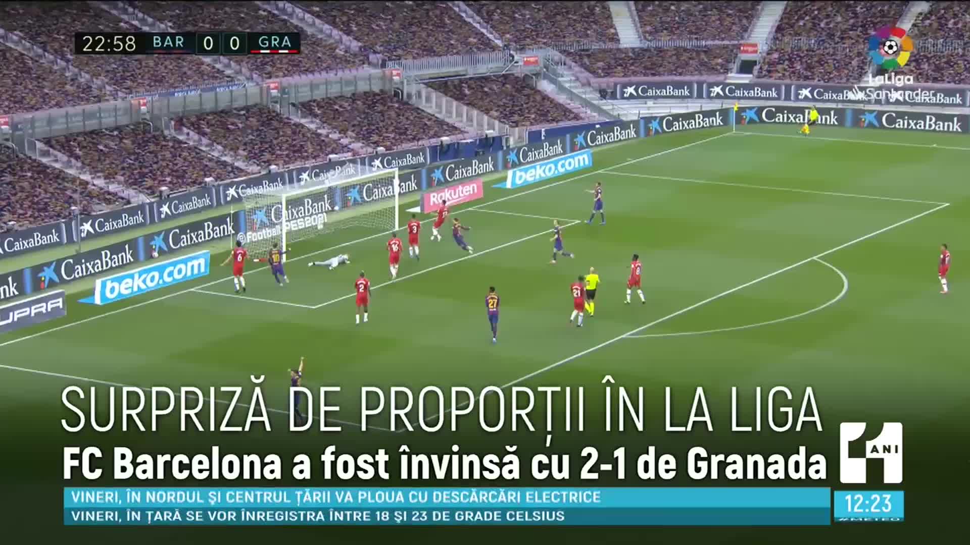 FC Barcelona a ratat șansa de a deveni lider în campionatul Spaniei de fotbal. Discipolii lui Ronald Koeman au pierdut meciul de pe teren propriu cu Granada, scor 1-2. Totul a început bine pentru catalani. Lionel Messi a marcat în minutul 23 după un „un-doi” spectaculos cu Antoine Griezmann.