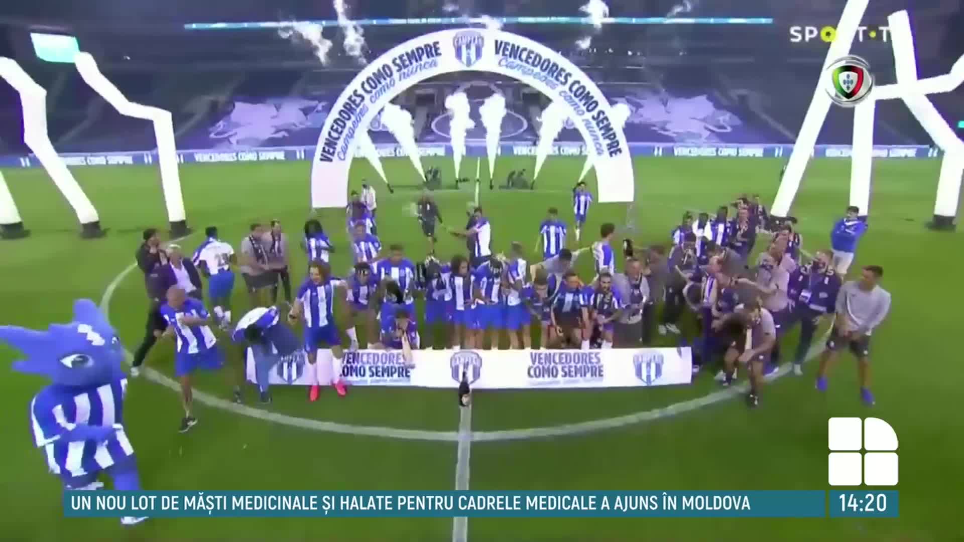 Jucătorii lui FC Porto au sărbătorit cucerirea titlului pe teren, iar apoi au luat cu asalt conferința de presă a antrenorului principal Sergio Conceicao.