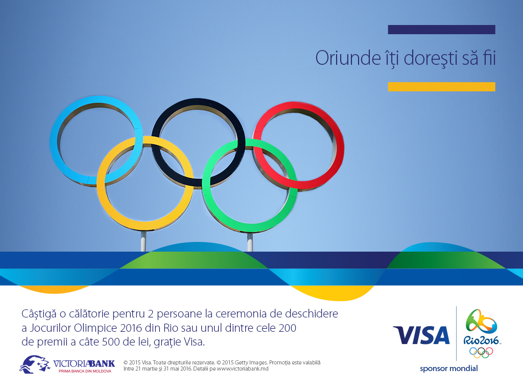 În perioada 21 martie – 31 mai 2016 Victoriabank şi VISA oferă tuturor clienţilor oportunitatea unică de a câştiga o călătorie pentru două persoane la cel mai grandios eveniment al anului – ceremonia de deschidere a Jocurilor Olimpice de vară 2016 din Rio de Janeiro, Brazilia sau unul dintre cele 200 de premii a câte 500 de lei fiecare.