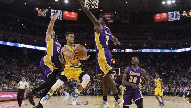 Warriors a început superb partida cu Lakers, reuşind să câştige primul sfert cu scorul 30-11. Spre final de meci, Golden State şi-a mărit avantajul şi s-a impus la o diferenţă de 34 de puncte. Jucătorul meciului a fost Stephen Curry, care a marcat 24 de puncte.