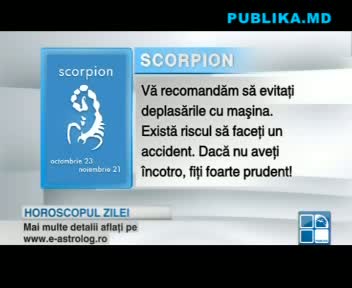 SCORPION: Vă recomandăm să evitaţi deplasările cu maşina. Există riscul să faceţi un accident. Dacă nu aveţi încotro, fiţi foarte prudent!