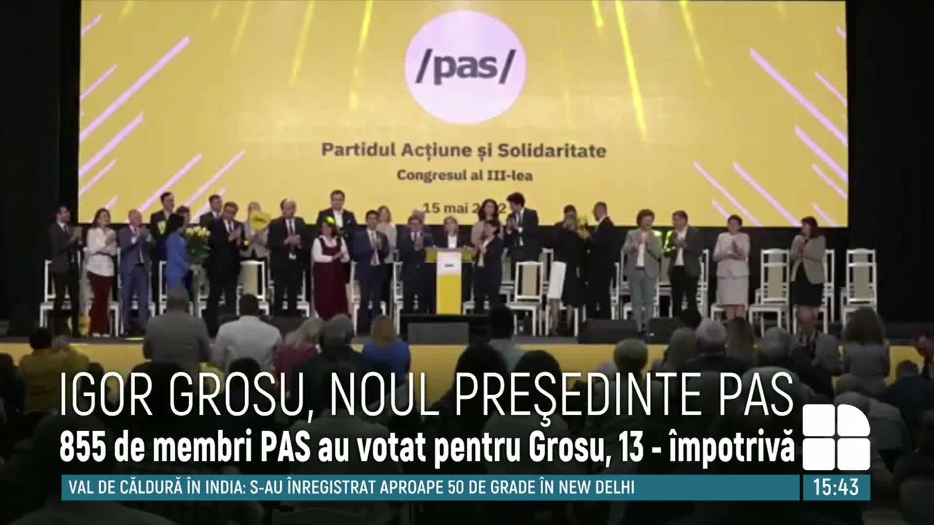 Partidul Acţiune şi Solidaritate are un nou preşedinte: speakerul Igor Grosu. El a fost singurul candidat la şefia partidului şi va conduce PAS în următorii patru ani. Decizia a fost luată la Congresul din 15 mai, cu 855 de voturi pentru şi 13 împotrivă. Igor Grosu a mulţumit pentru susţinerea acordată şi a anunţat că formaţiunea se va pregăti pentru următoarele curse electorale.