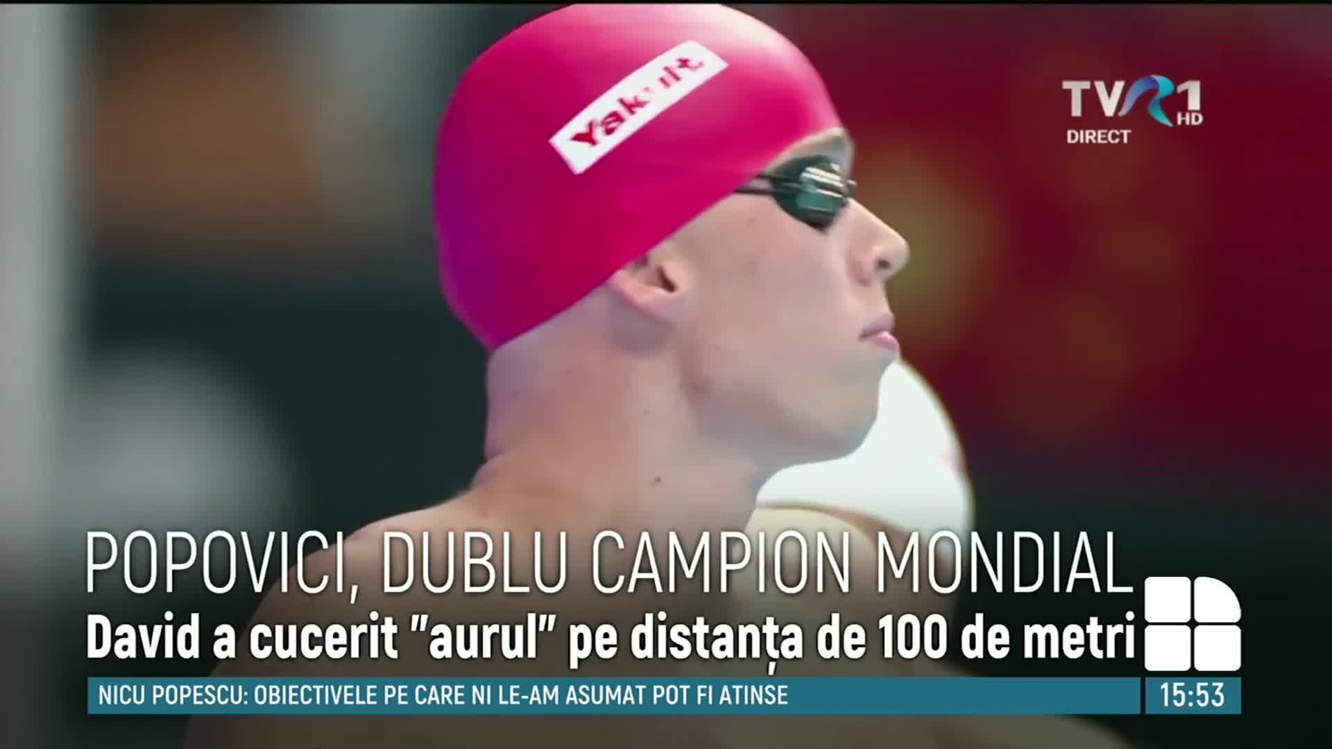 Înotătorul român David Popovici este dublu campion mondial. Sportivul de 17 ani a cucerit medalia de aur și pe distanța de 100 de metri la competițiile de la Budapesta, după ce s-a impus în proba de 200 de metri stil liber. În finală, Popovici l-a învins la limită pe francezul Maxime Grousset.