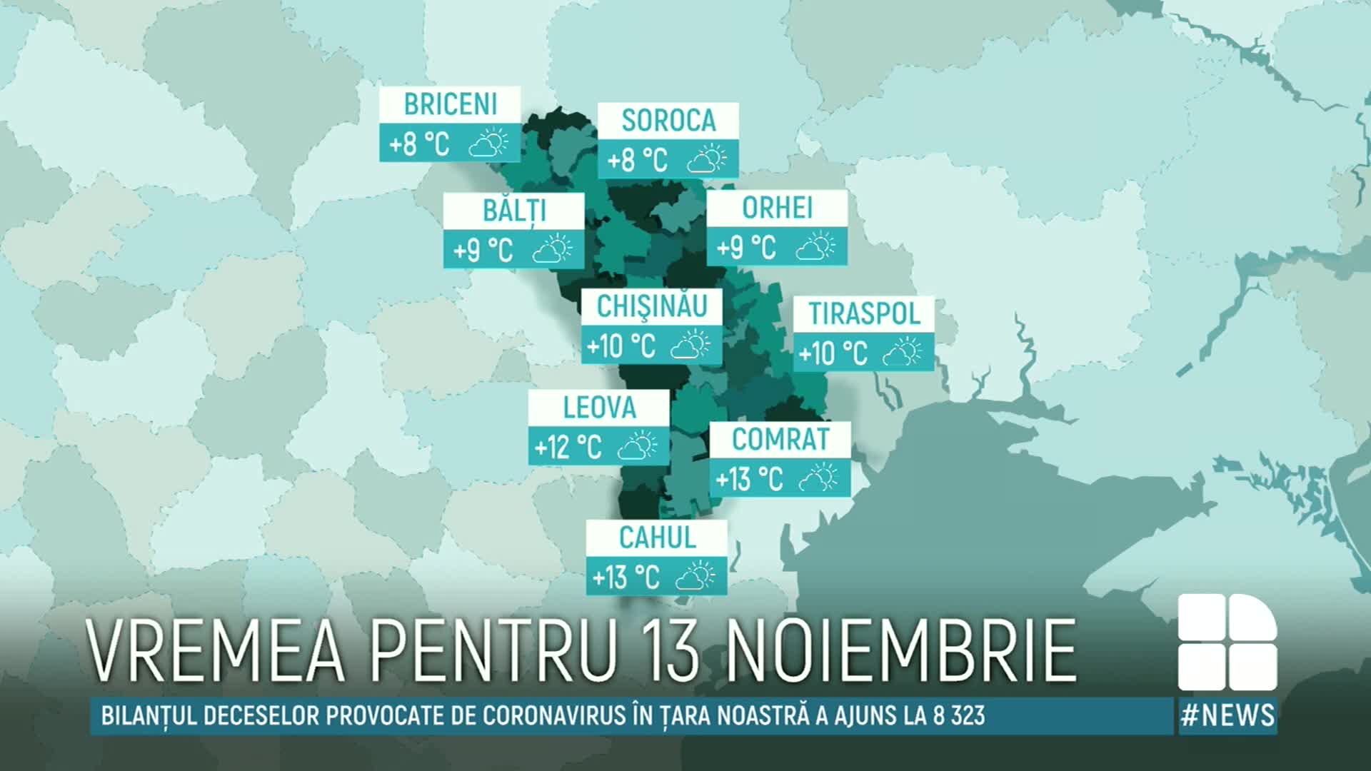 Sâmbătă, meteorologii prognozează cer variabil în toată ţara. La Briceni şi Soroca vor fi cel mult 8 grade Celsius, iar la Bălţi şi Orhei cu un grad mai mult. La Tiraspol vor fi 10 grade, la Leova 12, iar la Comrat și Cahul câte 13 grade Celsius. În Capitală sunt prognozate 10 grade Celsius.