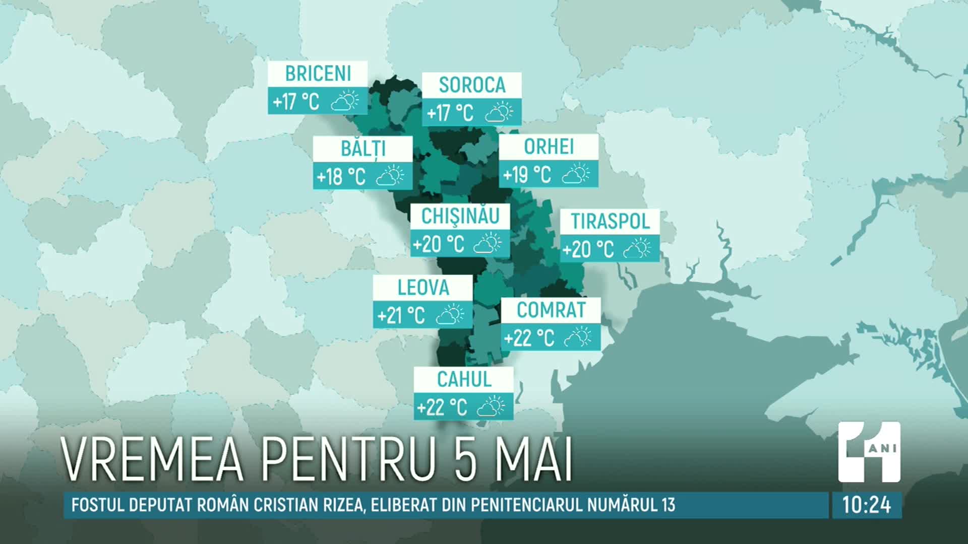 Pentru miercuri meteorologii prognozează vreme caldă, cer variabil, fără precipitaţii. La Briceni şi Soroca vor fi 17 grade, la Bălţi 18, la Orhei cu un grad mai cald. La Tiraspol maxima va fi de 20 de grade, iar la Leova cu unul mai mult. Cel mai cald va fi la sud. 22 de grade se vor înregistra la Comrat şi la Cahul.