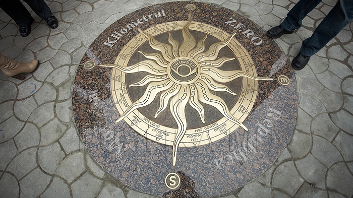 Monumentul "Kilometrul Zero" a fost inaugurat oficial în această dimineaţă. Placa din bronz şi granit reprezintă Roza vânturilor în formă stilizată, pe care sunt indicate distanţele din centrul Chişinăului până la capitalele mai multor state europene. Ideea aparţine Poştei Centrale din Capitală.