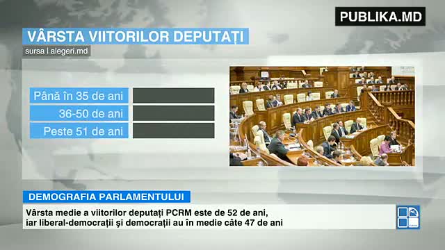 Noii deputaţi PCRM au în medie 52 de ani, aleşii liberali - 49, iar socialiştii – 48 de ani. Mai tineri sunt democraţii şi liberal-democraţii, a căror vârstă medie este de 47 de ani.