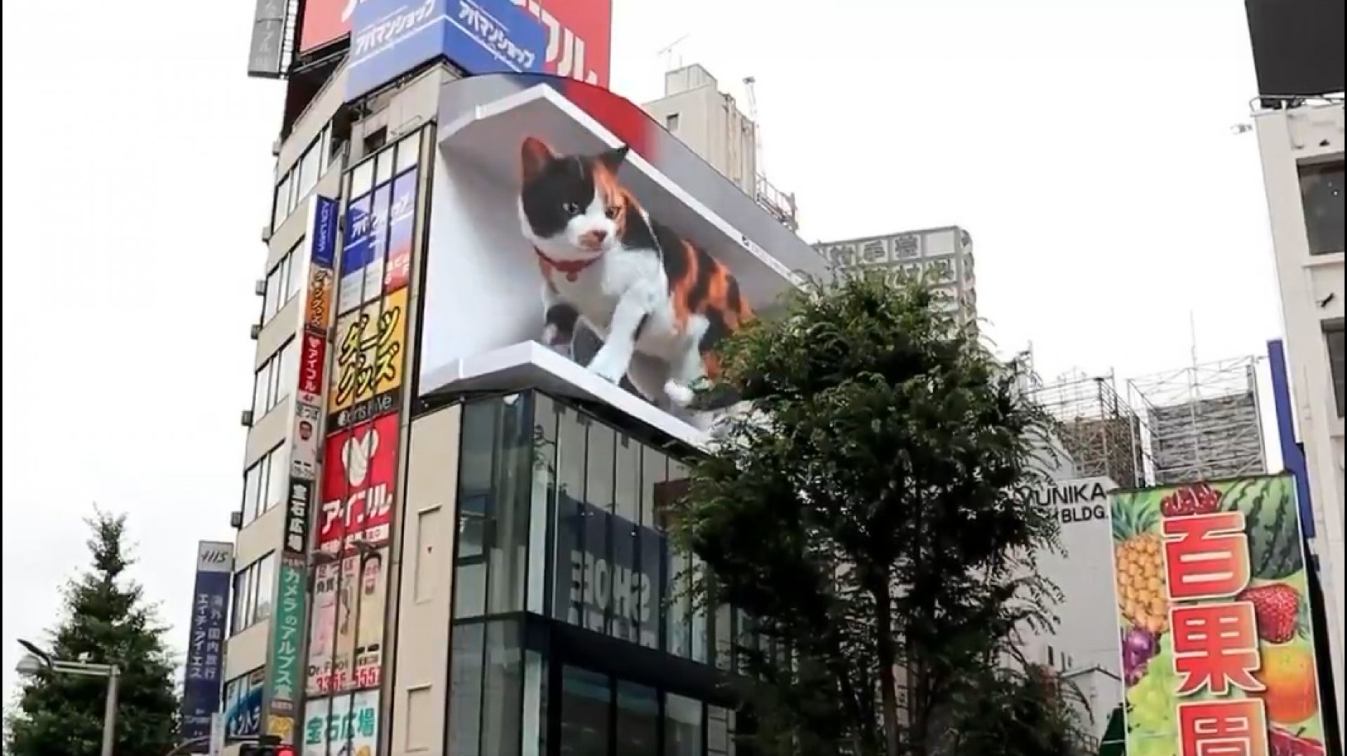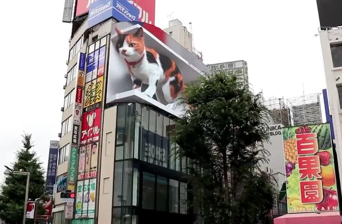 Un panou publicitar 3D din Japonia a dat în ultimele zile viață unei pisici gigantice care toarce și se pisicește deasupra unei gări din oraș. Afișată între reclame, imaginea atrage atenția prin mărimea sa. Panoul are 154 de metri pătrați.