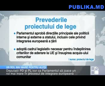 Parlamentul are un rol limitat în procesul de integrare europeană a Republicii Moldova, este puţin informat şi consultat de Executiv în acest sens. Este opinia liberalilor şi democraţilor, care au venit cu un proiect de lege menit să îmbunătăţească actualul cadru legal. Colegii lor de la PLDM spun că Legislativul are deja un rol important în acest domeniu.