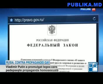 Preşedintele rus, Vladimir Putin, a promulgat legea care pedepseşte orice act de propagandă homosexuală printre minori. Potrivit proiectului de lege, propaganda relaţiilor sexuale netradiţionale în faţa unui copil este pasibilă de amenzi cuprinse între 100 şi 125 de euro, pentru orice persoană fizică. Suma ajunge însă la peste 23.000 de euro pentru persoanele juridice.