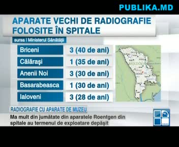 Spitalul raional din oraşul Briceni dispune de trei instalaţii de radiografie pe care medicii le folosesc de peste 40 de ani. La Călăraşi există un singur aparat de acest gen, în funcţiune de 35 de ani. Aceeaşi situaţie este şi la spitalul din Anenii Noi, unde instalaţiile similare sunt folosite de 3 decenii.