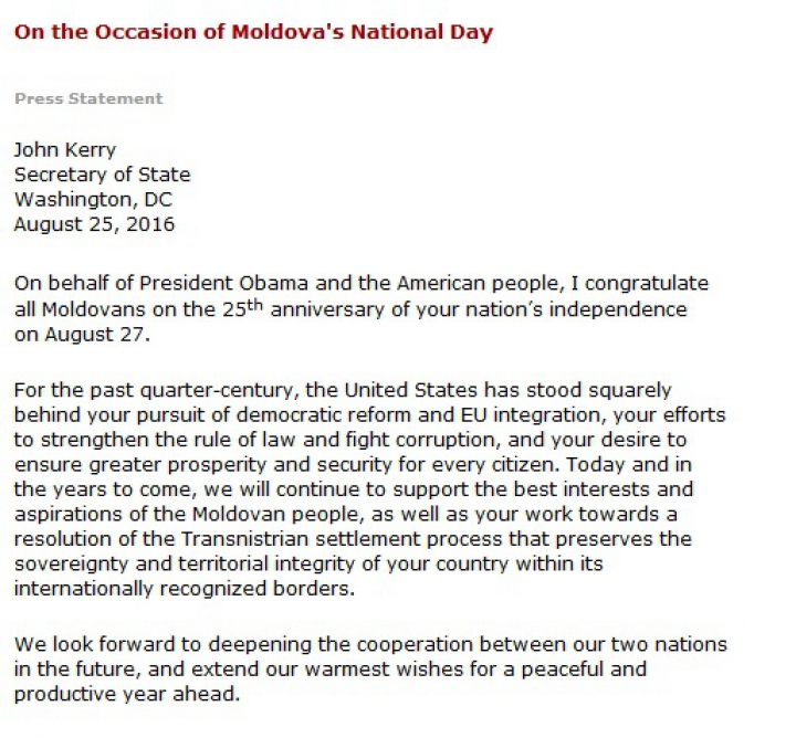 Secretarul de stat american, John Kerry, a transmis un mesaj de felicitare cu ocazia marcării a 25 de ani de la proclamarea Independenţei Republicii Moldova, scrie politics.md.