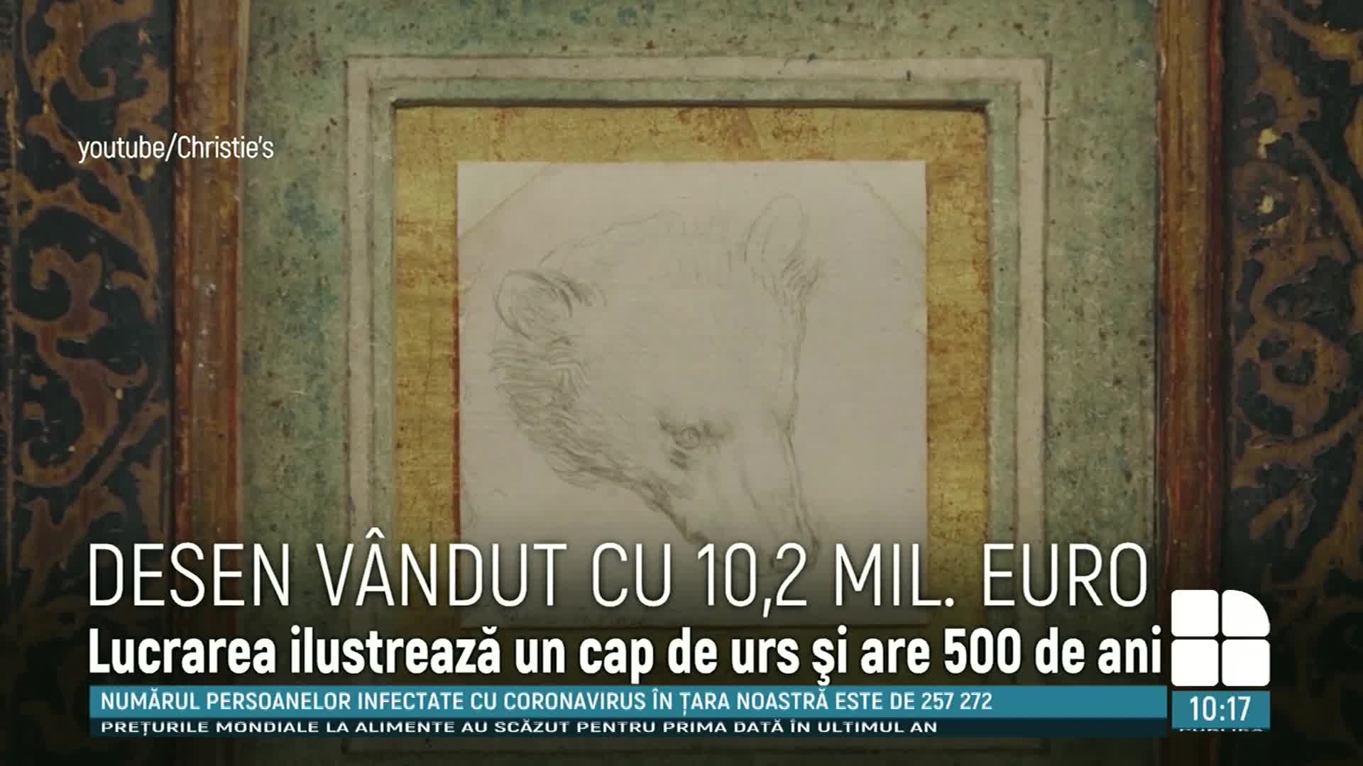 Un mic desen al capului unui urs realizat de Leonardo da Vinci s-ar putea vinde cu până la circa 14.000.000 de euro, la o licitaţie care va avea loc joi, 8 iulie, la Londra, informează postul BBC. Licitația e programată la ora 22.00, ora României.