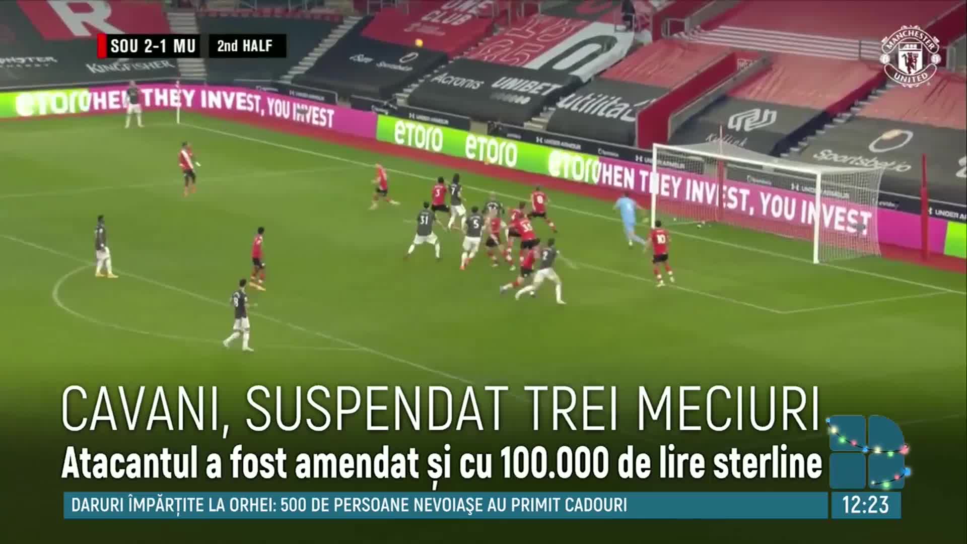 Din cauza suspendării, Edinson Cavani va rata meciul cu Aston Villa, din campionat, partida cu Manchester City din Cupei Ligii, dar și confruntarea cu Watford din Cupa Angliei.