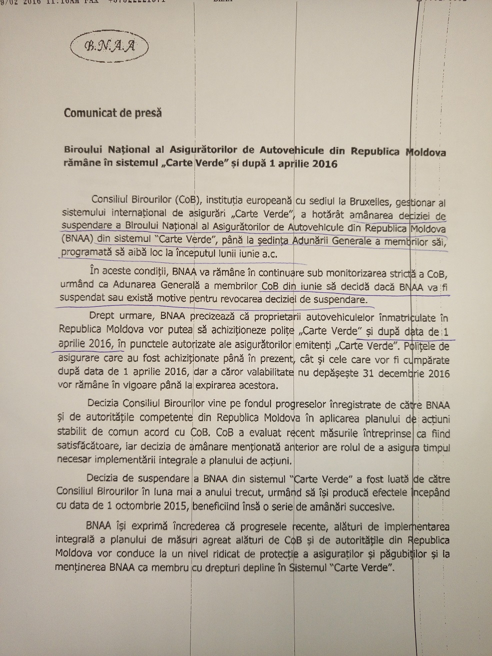 De asemenea, s-au înregistrat trucaje ale accidentelor rutiere pe teritoriul Moldovei cu asigurări internaţionale şi invers. În consecinţă, în septembrie 2015, autoritatea de la Bruxelles a transmis BNAA-ului un set de cerinţe, care trebuiau îndeplinite până în luna martie a acestui an, pentru a evita suspendarea sau chiar excluderea din sistemul de asigurare internaţională.