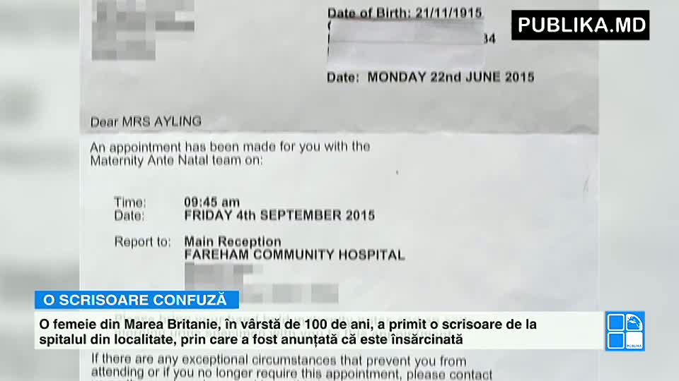 O femeie din Marea Britanie, în vârstă de 100 de ani, a primit o scrisoare de la spitalul din localitate, prin care a fost anunțată că este însărcinată. Centenara Doris Ayling a fost informată că, în situația ei, trebuie să dea cât mai curând analize medicale.