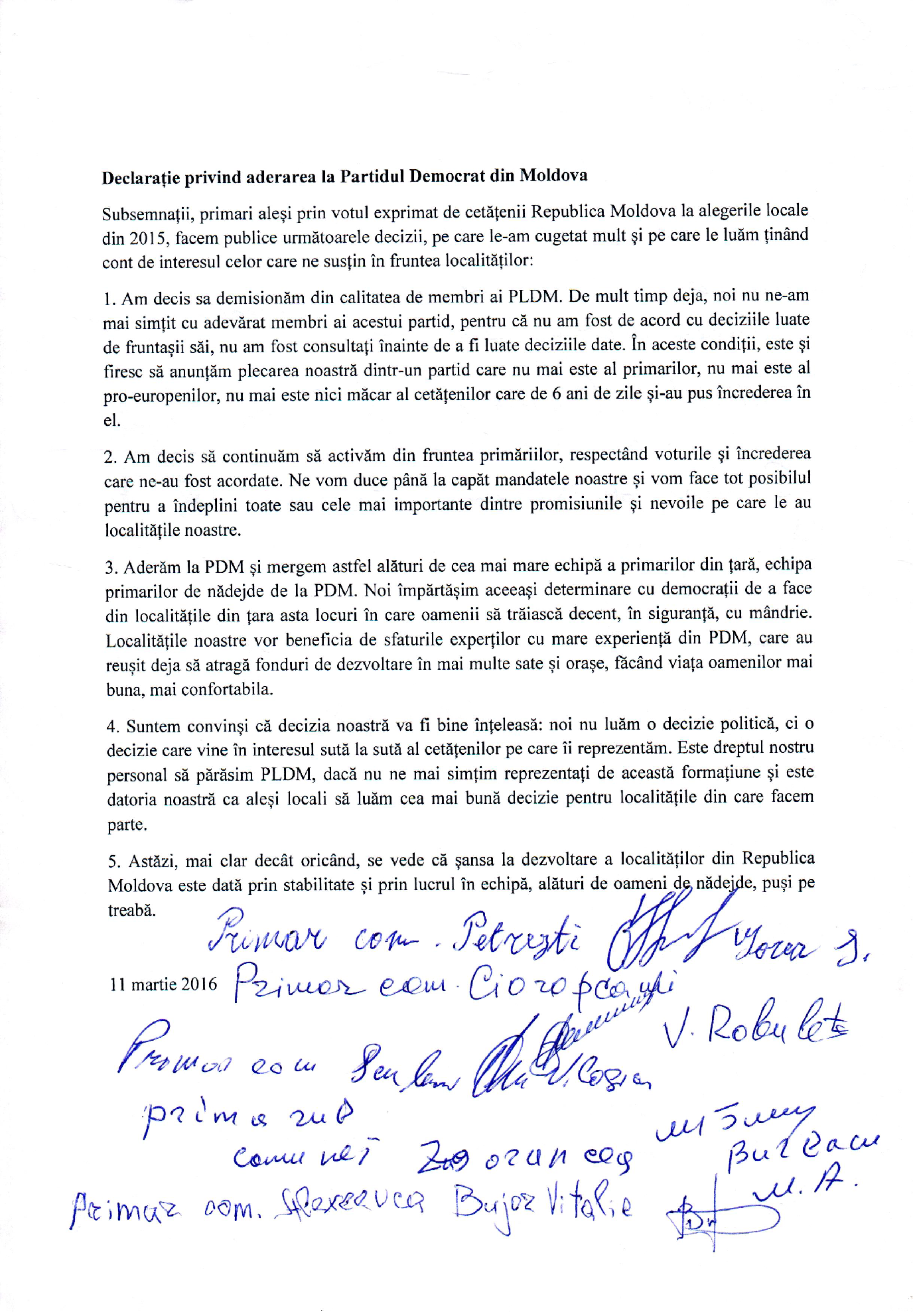 Zece primari din mai multe sate din raioanele Ungheni, Râşcani şi Şoldăneşti au anunţat că demisionează din PLDM şi aderă la Partidul Democrat din Moldova.