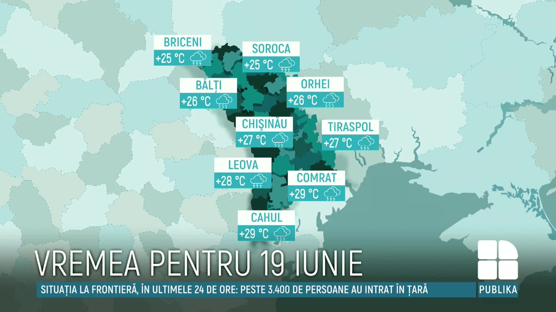 Astăzi, în ţara va ploua cu descărcări electrice. La Briceni și Soroca vor fi 25 de grade, iar la Bălţi şi Orhei 26. Cu un grad mai mult va fi la Tiraspol. La Leova maxima va fi de 28 de grade. La Comrat şi Cahul se va încălzi până la 29 de grade.
